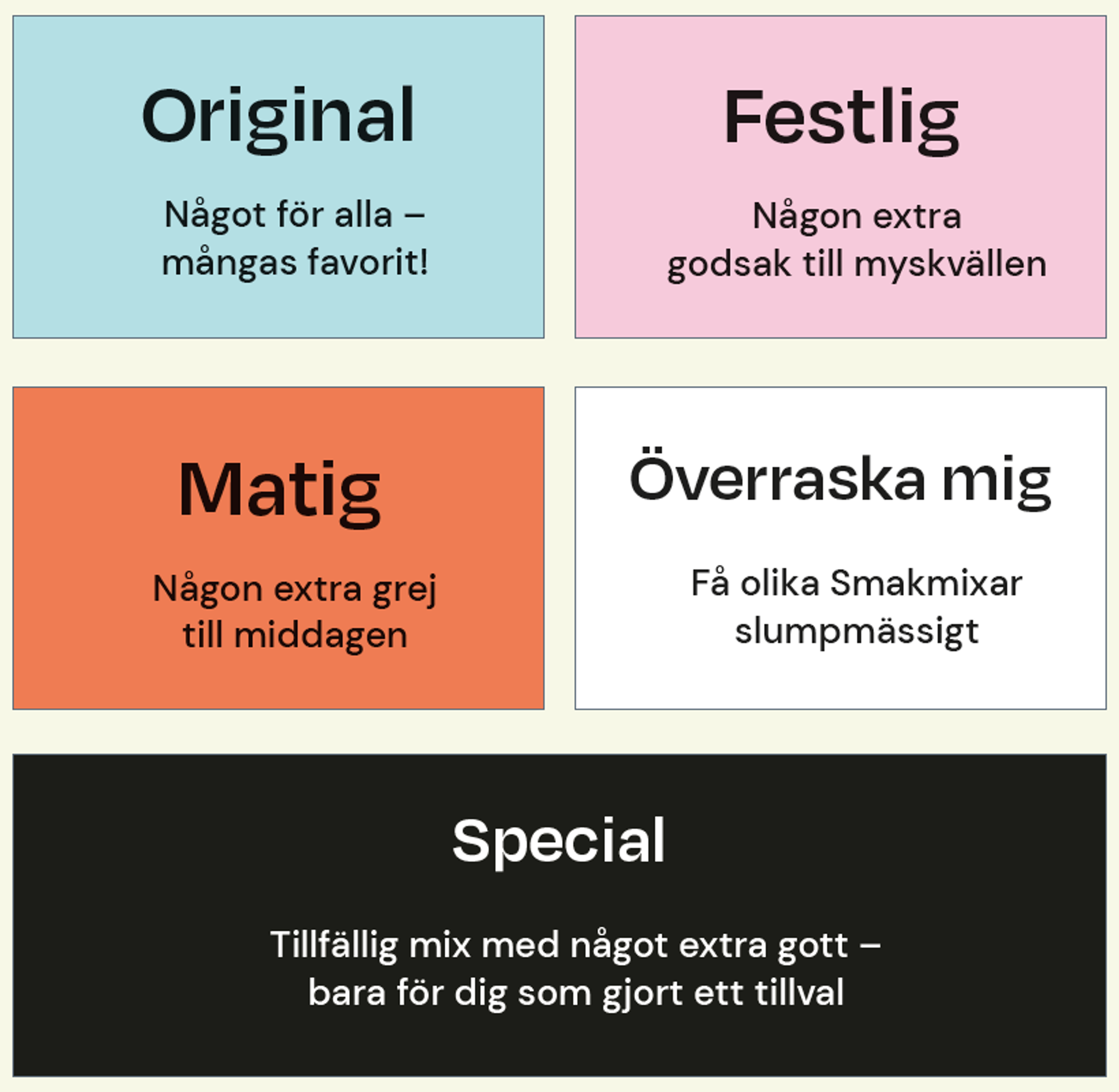 Du kan göra din box mer personlig genom att välja mellan våra tre Smakmixar Original, Matig och Festlig. Det mesta av innehållet är samma men några produkter skiljer sig åt.